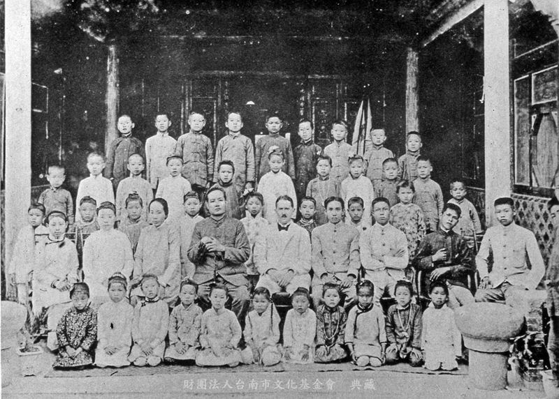 長榮中學後來也在東門教會附設小學,圖中打蝴蝶結的便是長榮中學校長萬榮華,他右邊式黃俟命牧師,時間是1919年左右。(撰文:詹伯望)