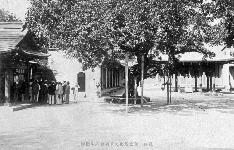 出自《台灣之旅─全國圖書協議會員台灣視察》 日本國家圖書協議會員至台灣各地名勝視察,所留下的紀錄照片。與C03B09-003同。開山神社參拜後祭神的遺墨拜觀(抄錄原圖說明)。開山神社即今之延平郡王祠。其興建乃起源於清同治13年(1874)10月,福建船政欽差大臣沈葆楨蒞台後,以「鄭氏明知孤臣,非國朝之亂賊」,奏請清廷賜號並建專祠祭祀,直至翌年,始獲禮部批准鳩工興築,為一福州風格之建築,稱開山聖王廟,並由皇帝賜頒「忠節」。日治時期,日人在原有建築前新建一日本社殿風格之建築(即目前圖片所見),並改稱「開山神社