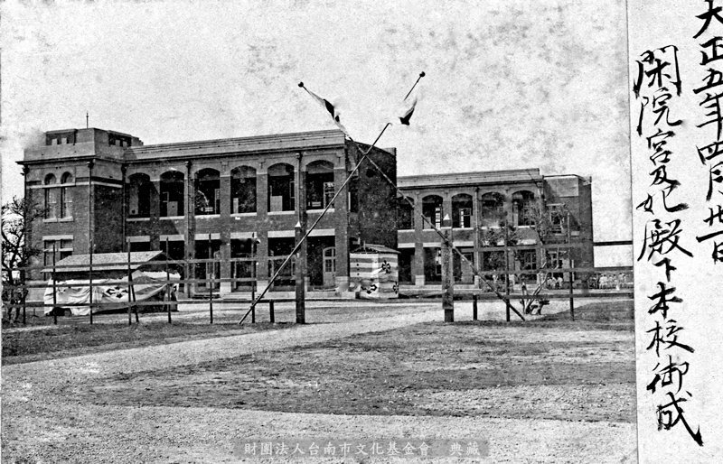 一邊在兩廣會館上課,一邊也在新建校舍。1915年3月,南部官民捐獻了二萬二千五百多坪的地,由總督俯營繕課設計,在台南市的大北門外,興建紅樓。有趣的是,初期校舍只建了三分之一左右,建物外緣猶留有鋸齒狀的磚縫,為日後的增建預留餘地,以致1916年4月,日本皇室閑院宮殿下到該校視察時,校景便成為這副怪模樣,那時連圍牆都沒有,簡單的木欄門口,掛著「台灣總督府台南中學校」的木牌。(撰文:詹伯望)