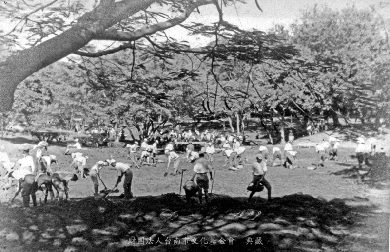 1938年,州立台南一中學生,到校旁的台南公園進行「奉仕作業」,也就是勞動服務。他們用竹蔑編成的擔架扛抬泥土,似在鋪設道路。(撰文:詹伯望)