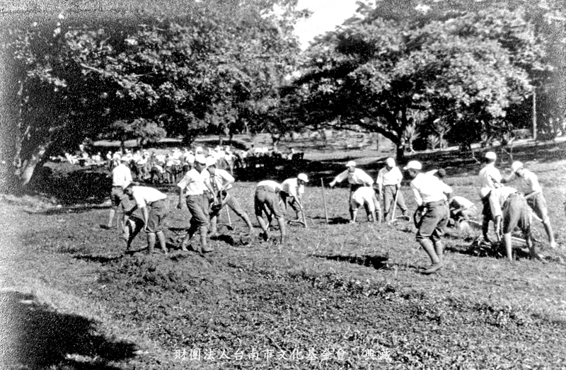 1940年,州立台南一中學生,到校旁的台南公園進行「奉仕作業」,也就是勞動服務。他們用竹蔑編成的擔架扛抬泥土,似在鋪設道路。(撰文:詹伯望)
