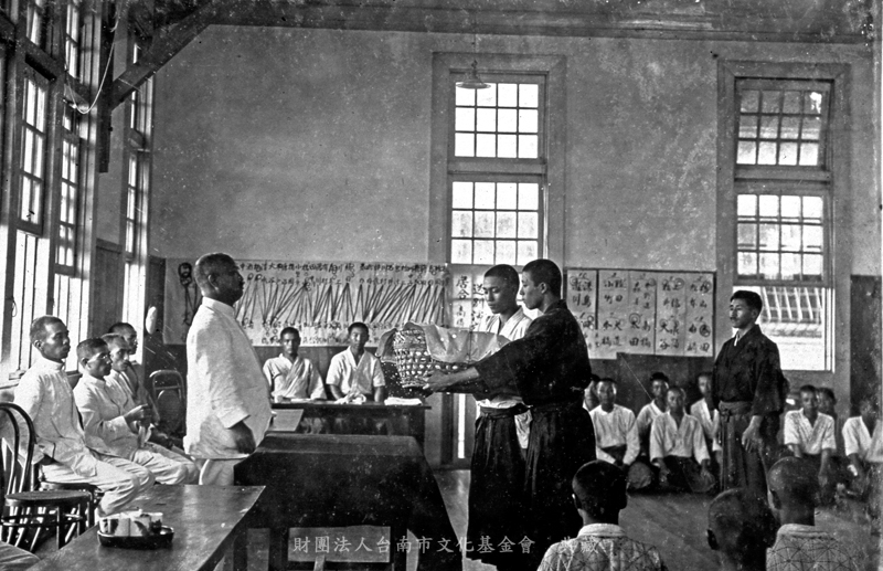 1921年,總督府台南中學校柔道館拍攝場面。學生分成兩邊,各派代表出馬對摔。門楣的牆上掛著一塊塊學生的名牌。(撰文:詹伯望)相關說明請見《重道崇文》151頁說明。