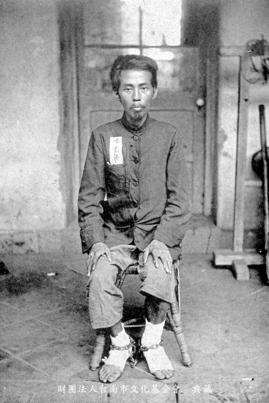 出自大正5年所發行的《台灣南部匪徒討伐警察隊記念》。 遭討伐警察隊逮捕的抗日首腦余清芳,攝於礁吧哖支廳前。 胸前之名牌與腳鐐清楚說明日人視其為匪徒的身分認定。 這位領導台灣最大樁抗日事件的首腦,僅經一審判決,即在判刑後兩天處死。以下則是台灣總督府關於「余清芳事件」將其絞死的報告檔案:「臨法發第七十三號『執行死刑報告書』大正年九月廿三日在台南監獄,依照成規執行完訖。謹此呈報台南廳長治二圖里後鄉庄 551號,米商余清芳37歲,別號:余先生、余春清、余滄浪、余清風、徐清風」。 該照片是余清芳於民國4年(大正4年