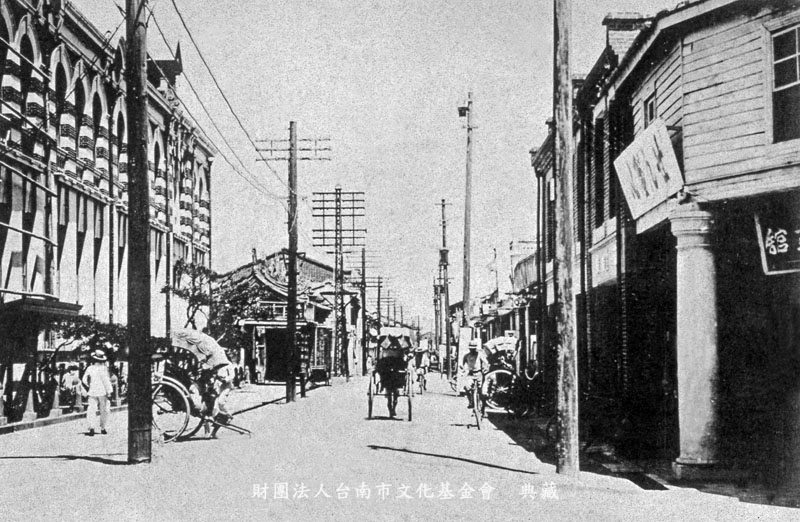 出自《台灣寫真帖》。拍攝角度為當時的打石街(今民生路)與上橫街(今忠義路) 路口往上橫街朝北取景。路口左邊為白金町,右邊則為錦町。左邊為台南郵便電信局,建於明治42年(1909),是當時全台第一大郵便局。位於其北邊的廟宇則為溫陵媽廟。