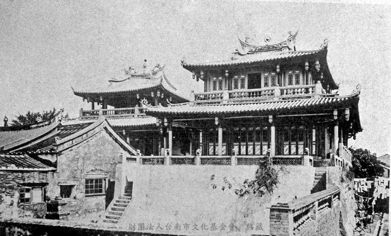 出自《台灣寫真帖》。明天啟5年(1625)前後,荷蘭人向土著新港人購換赤崁一帶土地,設商館建市街,並以普羅民遮聯盟為該市街名稱,以紀念荷蘭獨立時的七州聯盟。明永曆7年(1653),荷人為了鞏固在台灣本島上之防衛能力,遂決定在赤崁地方,熱蘭遮城的對岸另築一城堡,以強化其守衛功能,以防叛亂,是年8月在一沙丘上破土奠基,並於翌年5月17日正式定名為普羅民遮城(Provintia),與台江對岸之熱蘭遮城遙遙相望。當地人士因其係建在赤崁地方,乃稱之為赤崁城,誘因該城規模不大略似高樓,所以也稱作赤崁樓,再因當時漢人稱