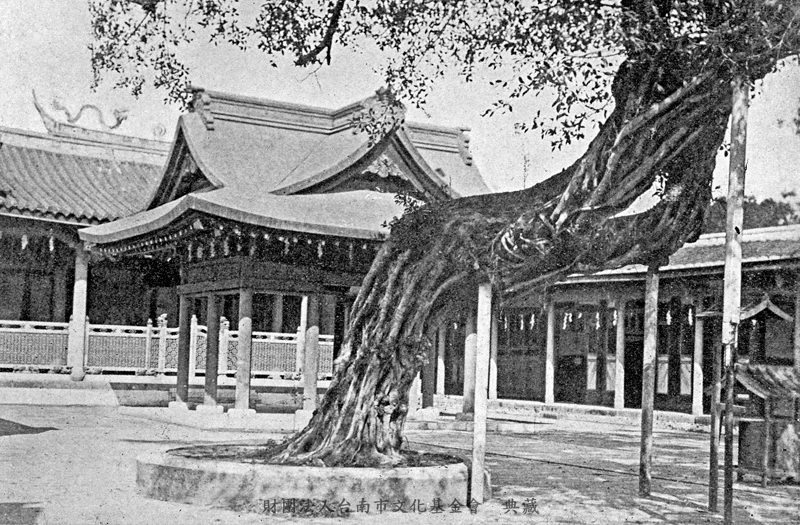 出自《日本地理大系─台灣篇》。開山神社即今之延平郡王祠。其興建乃起源於清同治13年(1874)10月,福建船政欽差大臣沈葆楨蒞台後,以「鄭氏明知孤臣,非國朝之亂賊」,奏請清廷賜號並建專祠祭祀,直至翌年,始獲禮部批准鳩工興築,為一福州風格之建築,稱開山聖王廟,並由皇帝賜頒「忠節」。日治時期,日人在原有建築前新建一日本社殿風格之建築(即目前圖片所見),並改稱「開山神社」。民國50年,因祠體日漸衰敗而決定加以整修,遂成立「民族英雄鄭成功史蹟修建委員會」籌畫修建。當時曾引起諸多爭議,然因彼時未有文化資產保存法,雖