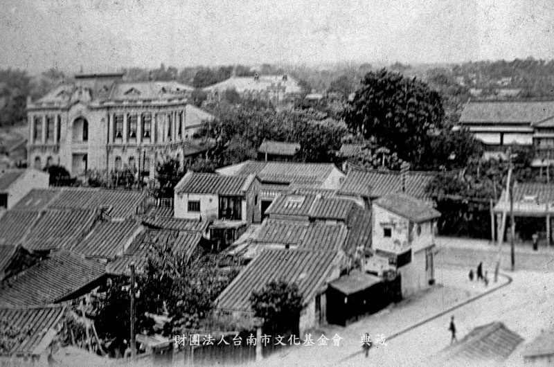 台南測候所的位置離民生綠園很近,古時有「鷲嶺」之稱,是台南市舊市區海拔最高的地方,即使在公園路開闢之後,也還高出路面約二公尺左右,所以從前是登高望遠的理想地點。這張照片便是站在台南測候所往東北方向拍攝的。畫面右上方的雄偉建築是台南公會堂,而它後方遠處的另一棟西式建築物則是台南醫院。1911年1月1日落成啟用的台南公會堂,在台灣光復之後被改為「省立台南社會教育館」,但該館由於房舍老舊、不敷使用已在最近遷往五期重劃區。由於原台南公會堂的建築極具特色,地方上呼籲保留的聲浪日起,而赤嵌文史工作室更企盼市府能將它整