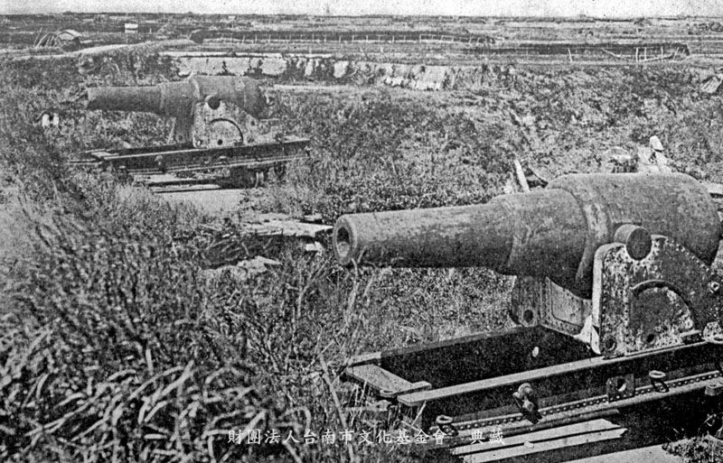 這是億載金城所陳列的阿姆斯壯18噸前膛大砲,看來十分威武。此大砲是由英人阿姆斯壯(William George Armstrong)所發展成功的,雖然曾在十九世紀中葉的克里米亞戰爭中立下戰功,但它的缺點是砲身單薄容易炸裂。沈葆楨所購進的五尊應是經過改良的,不過前膛裝藥的大砲,在裝填彈藥或清洗砲膛時仍會使士兵暴露在敵火下,十分危險。阿姆斯壯大砲的砲座,在砲台的西側,砲口一律朝向西邊的大海。砲座的前方有磚砌的護牆,牆中央砌成內凹的半弧形,地上有花崗岩用來固定砲架的前端軸心。以此為圓心砲架的後方有呈弧形排列的花