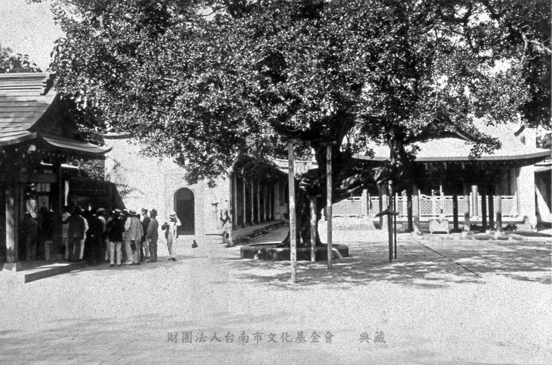 出自《台灣之旅─全國圖書協議會員台灣視察》日本國家圖書協議會員至台灣各地名勝視察,所留下的紀錄照片。與C02-023同。開山神社參拜後祭神的遺墨拜觀(抄錄原圖說明)。開山神社即今之延平郡王祠。其興建乃起源於清同治13年(1874)10月,福建船政欽差大臣沈葆楨蒞台後,以「鄭氏明知孤臣,非國朝之亂賊」,奏請清廷賜號並建專祠祭祀,直至翌年,始獲禮部批准鳩工興築,為一福州風格之建築,稱開山聖王廟,並由皇帝賜頒「忠節」。日治時期,日人在原有建築前新建一日本社殿風格之建築(即目前圖片所見),並改稱「開山神社」。