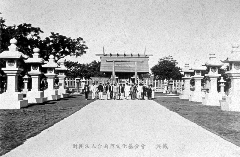 出自《台灣之旅─全國圖書協議會員台灣視察》日本國家圖書協議會員至台灣各地名勝視察,所留下的紀錄照片。與C02-025同。台南神社位於當時的南門町(今府前路、忠義路一帶)。其建造乃緣由於清光緒21年(日明治28年,1895),日本北白川宮能久親王率兵攻台,進入台南城後,因已感染重病(或曰被刺),遂於富商吳汝祥宅療養,但不久仍病逝。由於能久親王是日軍攻台戰役中,官階最高的殞命者,因之死後被日本官方封為「台灣鎮守之神」,並於日明治33年(1900)就吳宅建成「北白川宮紀念神殿」,以祭祀能久親王並保留其遺物(因之