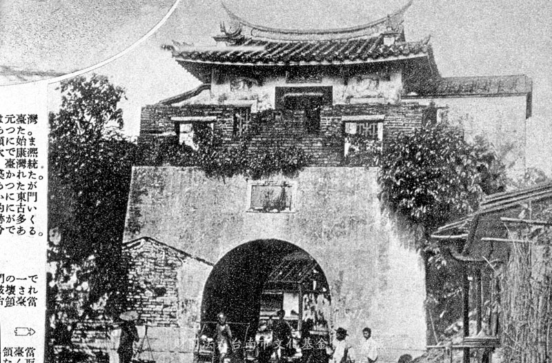 出自《台灣紹介/最新寫真集》小西門原在現今府前路和西門路口的東南角上,亦名「靖波門」,初建於乾隆四十年,不過它最早的位置還要更靠北方一些,要到乾隆五十三年才往南移。三十多年前市府拓寬道路時,本想將它拆掉,後來成功大學與市府交涉,又將它移至剛從軍方接收不久的光復校區,塞進台灣府城垣東門段的殘蹟之間,距離小東門遺址只有數十公尺而已。這是它尚在原址時所拍攝的照片,時間當在日治初期,多名小販挑著擔子,正要出城,城牆都還在,而門樓兩邊的小屋也都還算完整。〈撰文:詹伯望〉