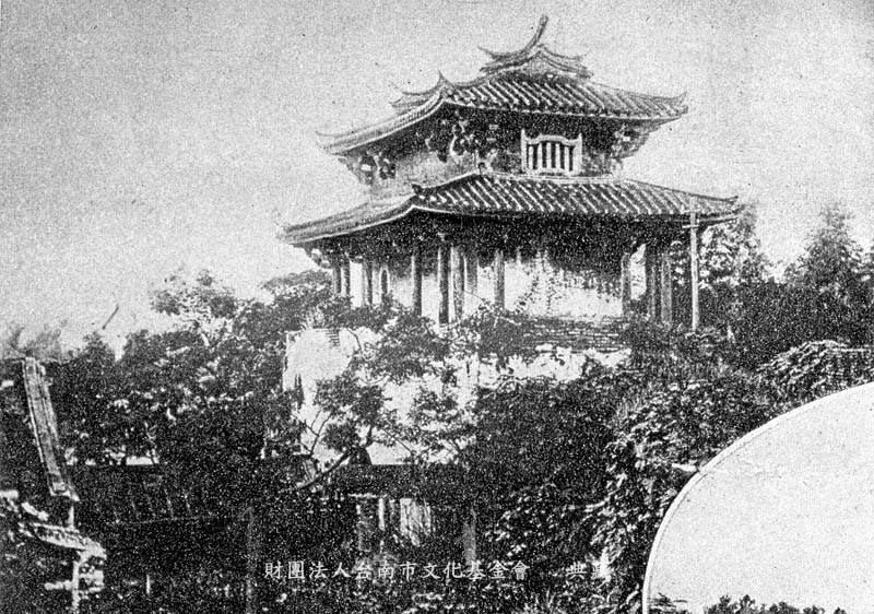 出自《台灣紹介/最新寫真集》這是大東門城的另一面,是從城內往城外拍的照片,但角度有點斜,幾乎是從西南往東北方向拍的了,城門周遭都是樹影,只有左方有閩南式民房的馬背式屋頂。〈撰文:詹伯望〉