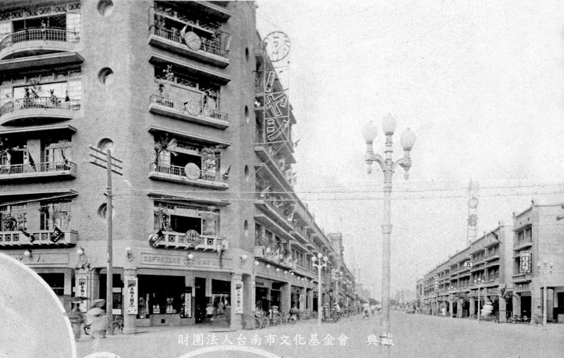 這張照片大約攝於一九三七年,以林百貨店為前景,拍攝銀座的街屋。兩旁同時興建的商店,只延伸到永福路口就停止了。這兩排房屋,是由技師梅澤澀三郎設計的,進駐的有百貨、藥局、酒商、運動器材、攝影、旅館、診所、傢俱、自行車、餅店等,這個街區很快就繁榮起來了。 林百貨店的正面,在每層樓的陽台上都掛上一個大字,合成「冬物賣出」四字,大概有如現在的「歲末大拍賣」,還到處插滿了「林」的旗幟,吊在外牆上的霓虹燈,上頭除了漢字「林」之外,還用三個片假名注音,讀如HAYASHI;而三角窗大門的門楣上,也有英文的店名。(撰文:詹伯