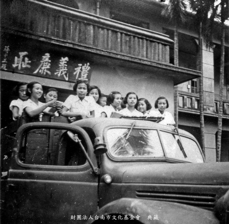 1952年,中國青年反共救國團成立,在學校裡發揮影響力,要求青年學生到軍中服務。這是1953年8月,光華女中的女生在該校主樓玄關前搭乘軍用卡車到營區所拍的照片。(撰文:詹伯望)