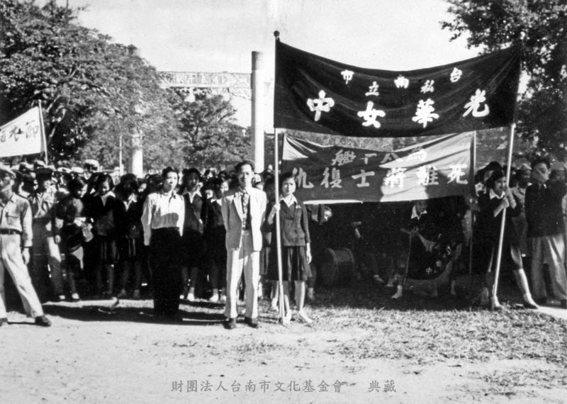 1954年8月,中共在福建沿海佈下重兵和大量船隻,9月3日並向金門發動猛烈炮擊。11月13日,我海軍太平鑑在大陳島附近巡戈時,遭中共艦艇擊沈,台南工學院學生隨即發起獻艦復仇運動。 這是光華女中和各學校學生,在忠烈祠前參加這項活動的照片。那個月底,美國把首批F–86軍刀式噴射機移交給我軍,但兩個月不到,也就是1955年1月20日,一江山的720名守軍就全部陣亡了。(撰文:詹伯望)